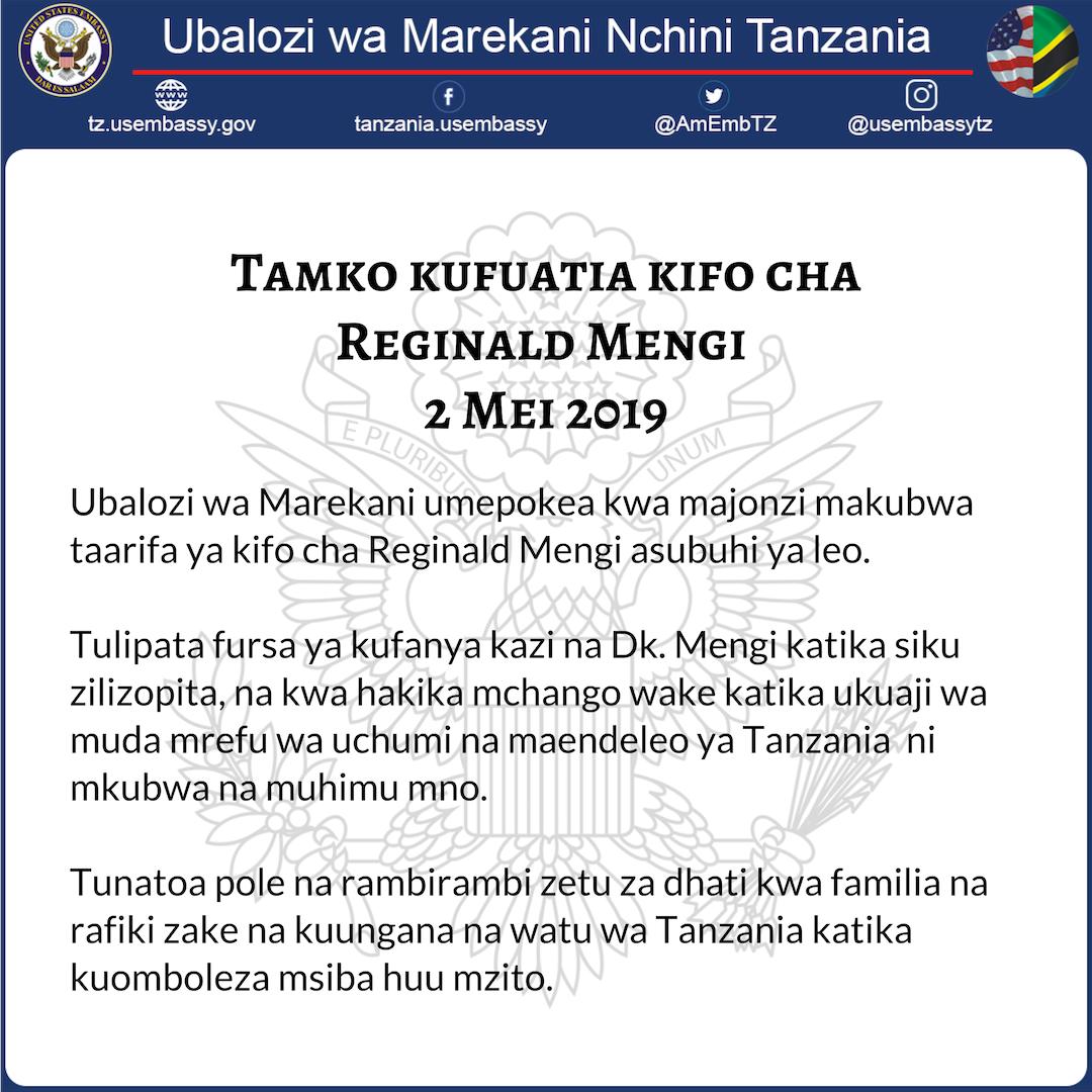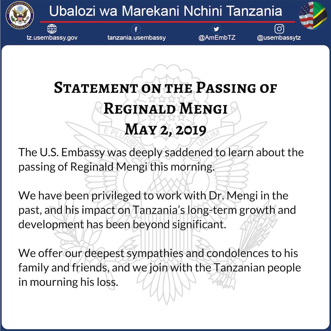 ”Tamko kufuatia kifo cha Reginald Mengi Ubalozi wa Marekani umepokea kwa majonzi makubwa taarifa ya kifo cha Reginald Mengi asubuhi ya leo — Statement on the Passing of Reginald Mengi The US Embassy was deeply saddened to learn about the passing of Reginald Mengi this morning,” imeandika ubalozi huo wa Marekani hapa nchini Tanzania.