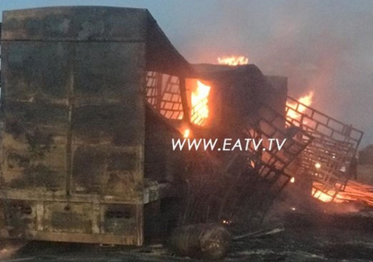 Gari mbili za mizigo, moja lenye namba za usajili scania T182 DCM lililokuwa linatokea Iringa kwenda Dar es salaam zimegongana uso kwa uso eneo la Ruvu mkoani Pwani, na kutekea kwa moto.