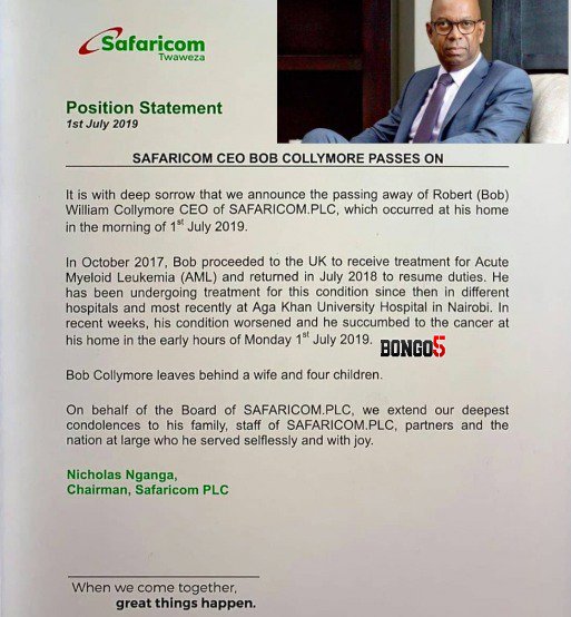 ”Ni huzuni kuwa asubuhi hii nimepokea taarifa za kifo cha Mkurugenzi wa Safaricom bwana Bob Collymore baada ya miaka kadhaa ya kupambana na saratani.Nchi imepoteza kiongozi ambaye mchango wake kwa Kenya utakumbukwa,” alisema Rais Uhuru Kenyatta.